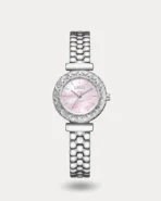 - ساعة نسائية بسير من الستانلس ستيل باللون الفضي بتصميم فريد يعكس الأناقة الكلاسيكية.