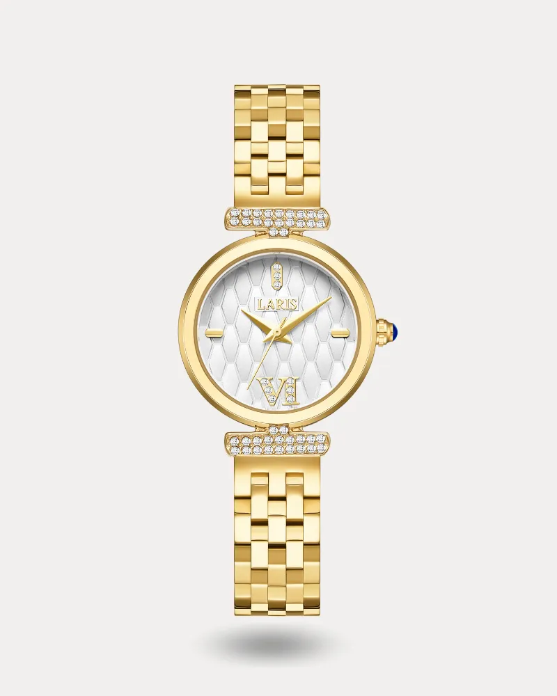 - إطار من الستيل باللون الذهبي المقاوم للصدأ مزين بفصوص براقة لإبراز الأناقة.