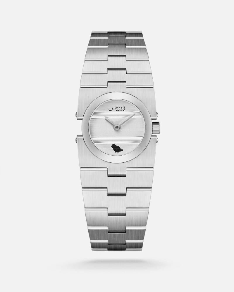 سيرها الفضي من الستانلس ستيل ينساب برقة حول معصمك، ليعكس وهجًا يتناغم مع حضورك، ميناؤها الأبيض الصغير، بحجم 19 مم، يحتضن الضوء برقة، بينما الإطار الفضي يحيط بها ليبرز جمالها. وفي قلبها، نُقشت خريطة المملكة العربية السعودية، إنها قطعة تحكي عنكِ، عن جمال التفاصيل التي تُميزك.