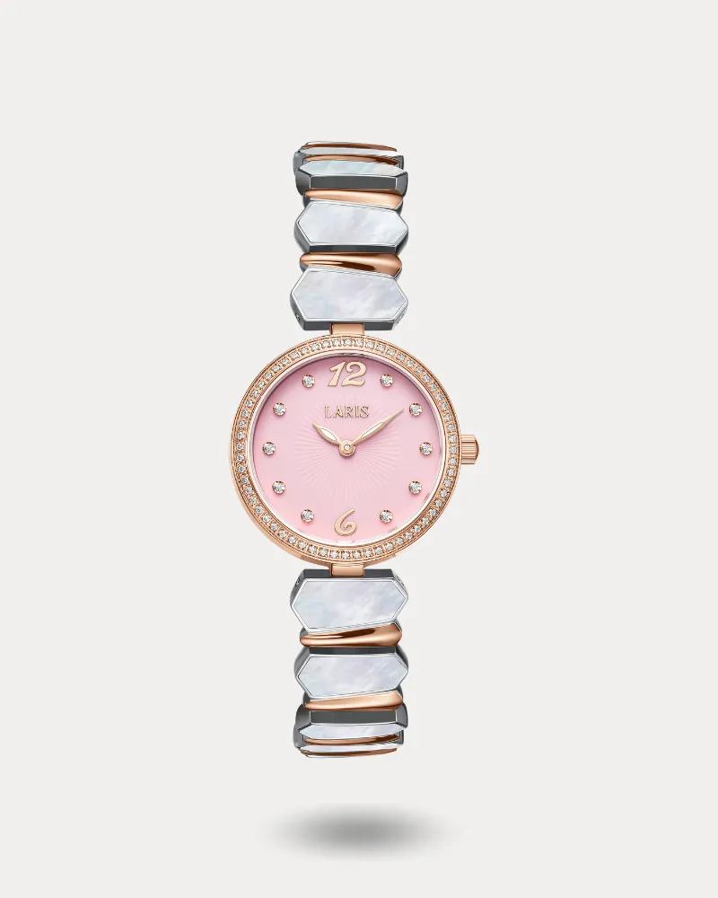 - سير ستيل أنيق بلونين الروزجولد والفضي بتصميم هندسي مرصع بالصدف.