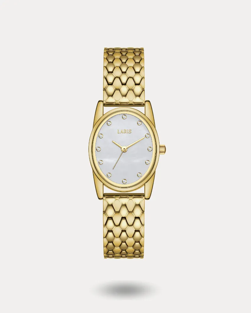 • مينا باللون الأبيض الصدفي مزين بفصوص براقة بدلاً من الأرقام، لإضافة لمسة من الأناقة والرقي.