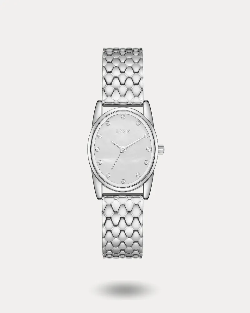 - مينا باللون الأبيض الصدفي مزين بفصوص براقة بدلاً من الأرقام، لإضافة لمسة من الأناقة والرقي.